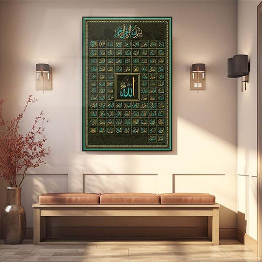 Asma Ul Husna Wall Art, Islamic Decor - UV Printed on Green Background
