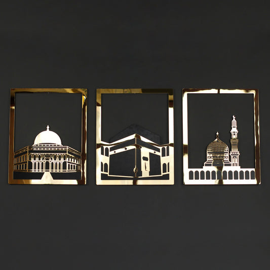 Kaaba, Al-Aqsa Mosque, Masjid an-Nabawi Wood Wall Art - Set of 3