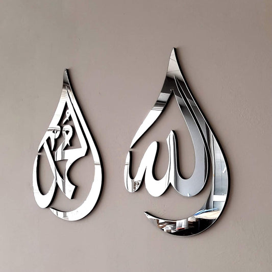 Allah and Muhammad Written Drop Shaped Wall Art, Islamic Wood Wall Art